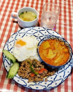 白いごはんに定番の目玉焼きがのり、ガパオがそえてある。マッサマンカレーは器に入って皿にのせてある。