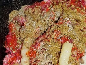 (↓スパイスを追加した2日目のケバブ。このあとラップをかけて温めて、昨日の残りの切った野菜とパンで食べた。改良版の方がおいしかった。※赤いスパイスはチリペッパー>パプリカパウダー)